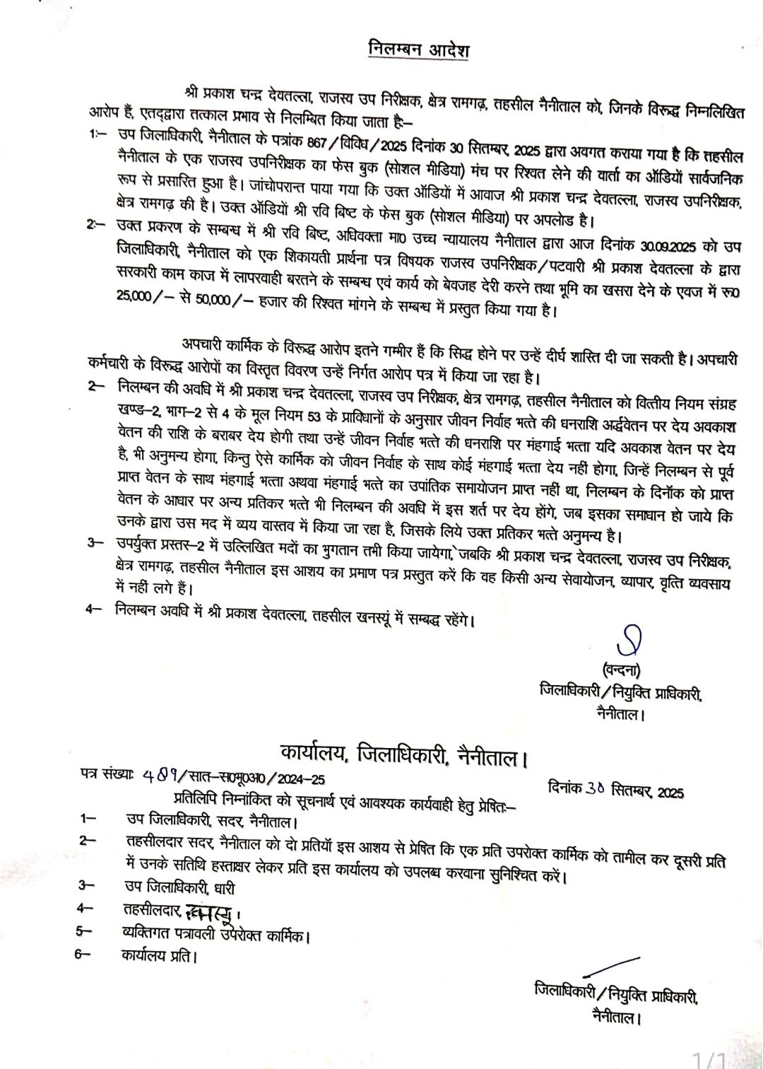 नैनीताल: उत्तराखंड के नैनीताल जिले में तैनात राजस्व उप निरीक्षक (पटवारी) प्रकाश चंद्र देवतल्ला को रिश्वत मांगने के आरोपी में जिलाधिकारी ने निलंबित कर दिया है. पटवारी प्रकाश चंद्र देवतल्ला के रिश्वत मांगने के कुछ