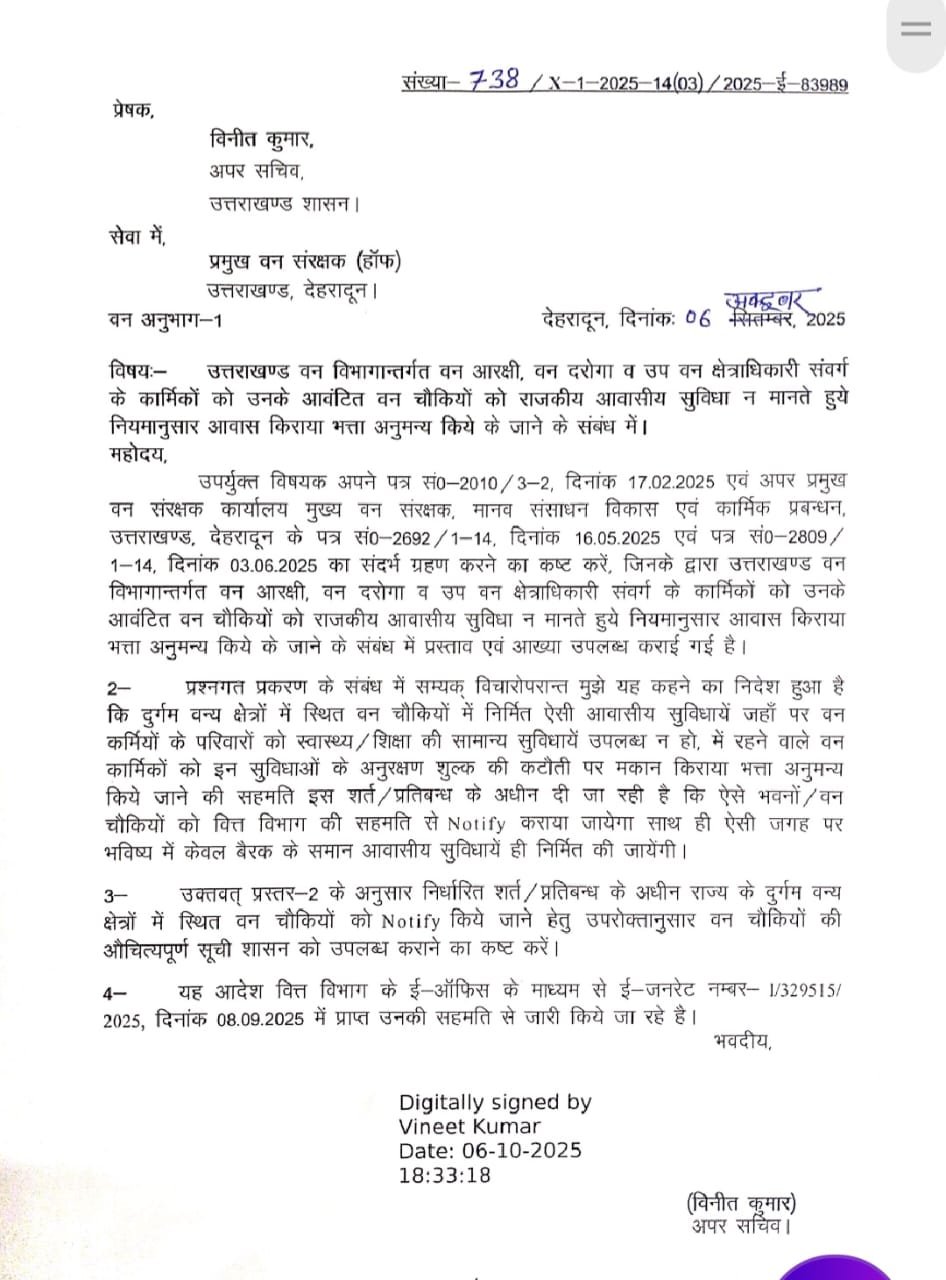 वन आरक्षियों, वन दारोगाओं और उप वन क्षेत्राधिकारियों को आवासीय भत्ता दिया जाएगा